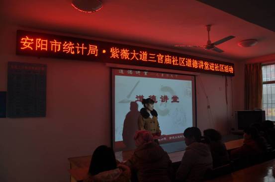 一是道德讲堂进社区活动。市统计局党员志愿者地调队副队长商允利同志,在三官庙社区会议室以“孝行天下”为主题为三官庙社区居民代表举办了道德讲堂,使社区居民进一步树立了孝敬父母的职责意识,引导大家从自己做起,从身边事情做起,在为他人送温暖、为社会做贡献、为家庭谋幸福中提升人生境界。