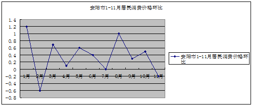 1-11月份,安阳市居民消费价格总水平同比上涨0.8%,除1-3月份同比涨幅超过1.0个百分点以外,其他各月同比指数涨幅总体相近,预计12月份居民消费价格总水平将会延续这一趋势,全年居民消费价格总水平同比涨幅不超过1.0%。